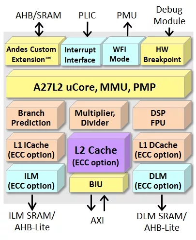 The 32-bit A27L2 is a 5-stage processor that supports the latest RISC-V specification, including “G” (“IMAFD”) standard instructions, “C” 16-bit compression instructions, “P” Packed-SIMD/DSP instructions, “N” for user-level interrupts, and Memory Management Unit (MMU) for Linux support.