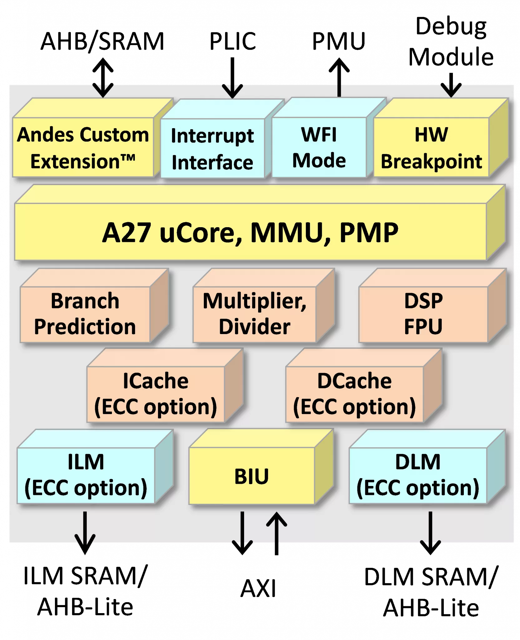 The 32-bit A27 is a 5-stage processor that supports the latest RISC-V specification, including "G" ("IMAFD") standard instructions, "C" 16-bit compression instructions, "P" Packed-SIMD/DSP instructions, "N" for user-level interrupts, and Memory Management Unit (MMU) for Linux support.