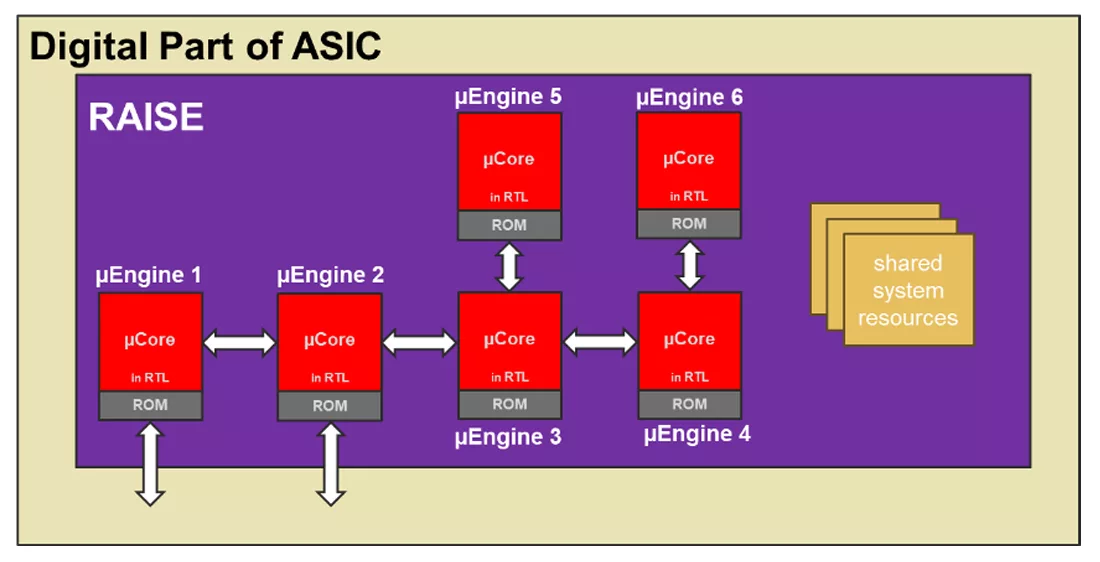 The RAISE system (Related Array of Independent Single-tasking µEngines) supports the parallel execution of different tasks, enabling the efficient implementation of complex operations. Each µEngine can be optimized for its specific function and disabled when not needed to save power.