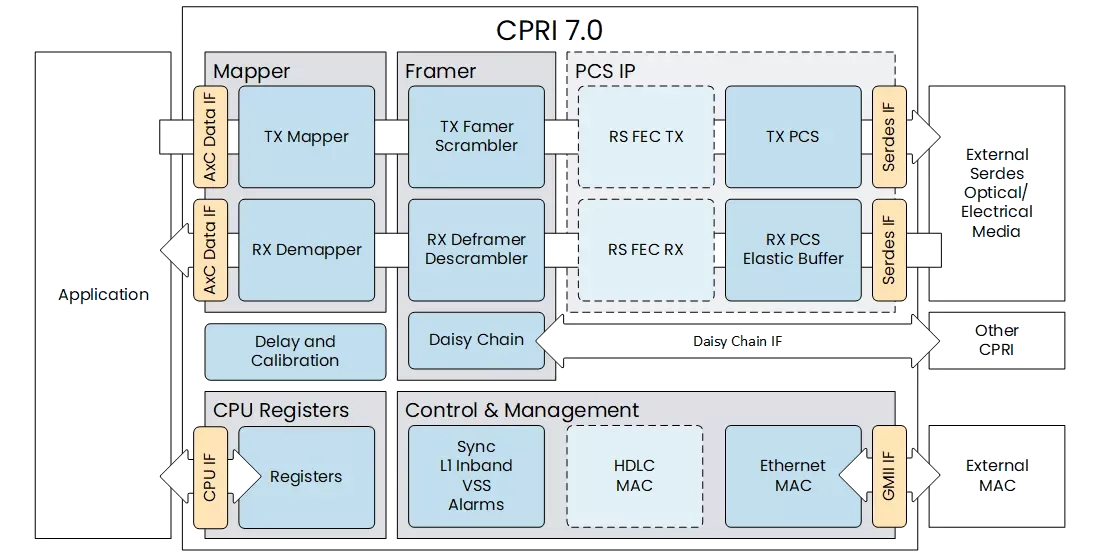 Highly mature, silicon proven and silicon agnostic IP core conforming to CPRI 7.0 specifications