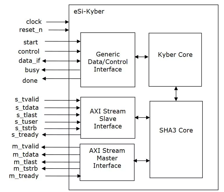 eSi-Kyber is a hardware accelerator core designed to accelerate post-quantum Key Encapsulation Mechanism (KEM) as defined by NIST FIPS 203.