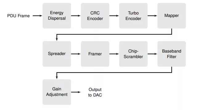 - The modulator comprises of scrambler (energy dispersal), CRC encoder, turbo encoder, framer, bit mapper, baseband filter (roll-off 20%), and gain adjustment