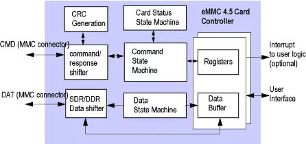 • Supports eMMC/MMC 4.5 command set and standard slave register set.