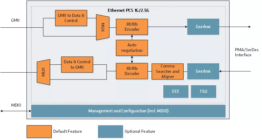The Ethernet PCS 1G2.5G IP core is a silicon agnostic implementation of the Physical Coding Sublayer (PCS) compliant with Ethernet standard IEEE 802.3-2018. The IP core supports 1G and 2.5G line rates, however other Ethernet PCS speeds are available, such as 10G/25G and 100G. The IP provides an interface between the Media Access Control (MAC) and Physical Medium Attachment (PMA) through a Gigabit Media Independent Interface (GMII) or Serial Gigabit Media Independent Interface (SGMII).