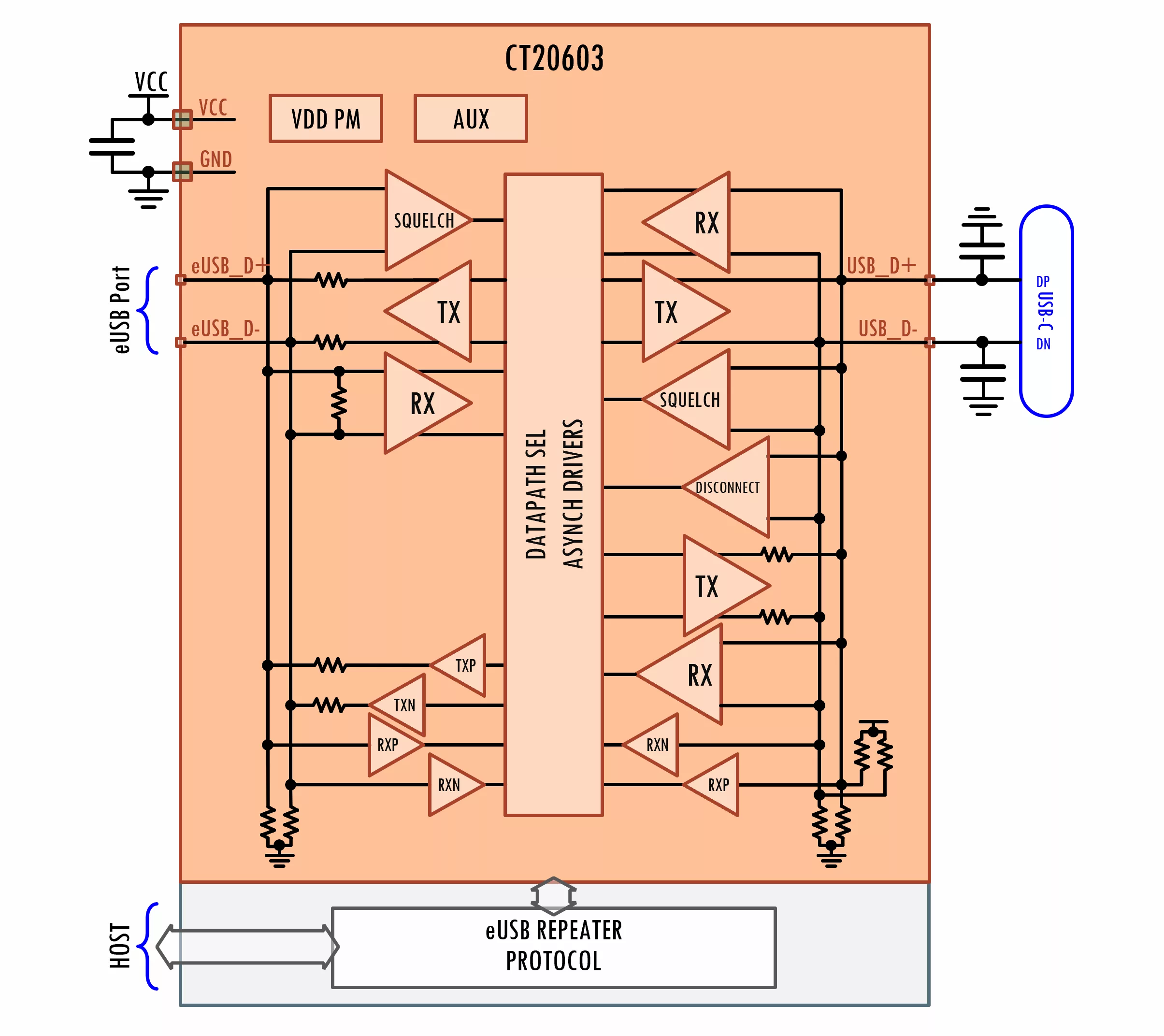 Packets are forwarded between eD+/eD- and D+/D- preserving timings required by the eUSB2 and USB2.0 specifications. The analog blocks of the CT20603 implement a half-duplex non-linear redriver, controlled by a two-level state machine that handles Port Reset and Repeater Configuration.