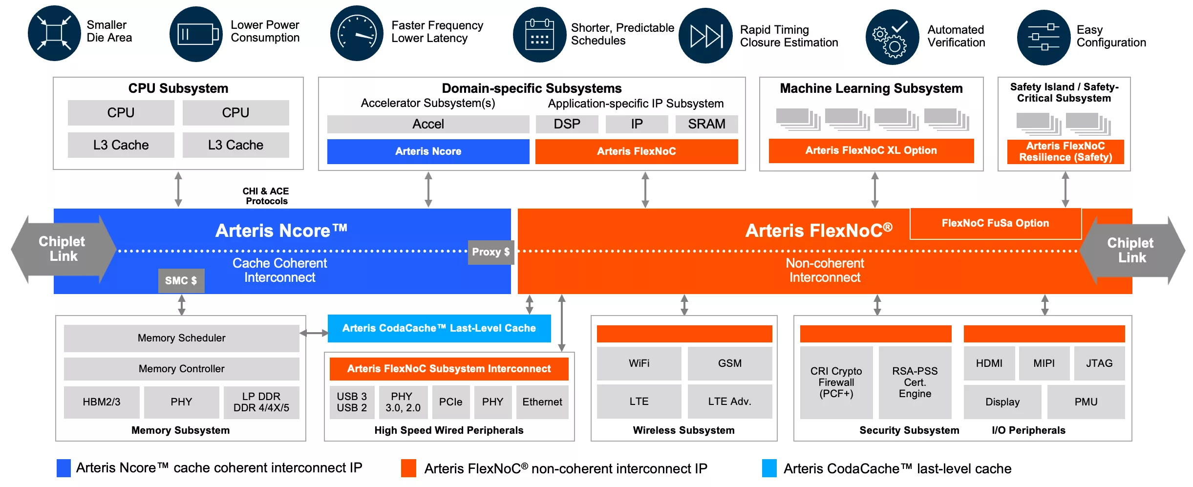 - FlexNoC drives performant on-chip data flow and access to off-chip memory by enabling multi-channel HBMx memory and high bandwidth data paths.