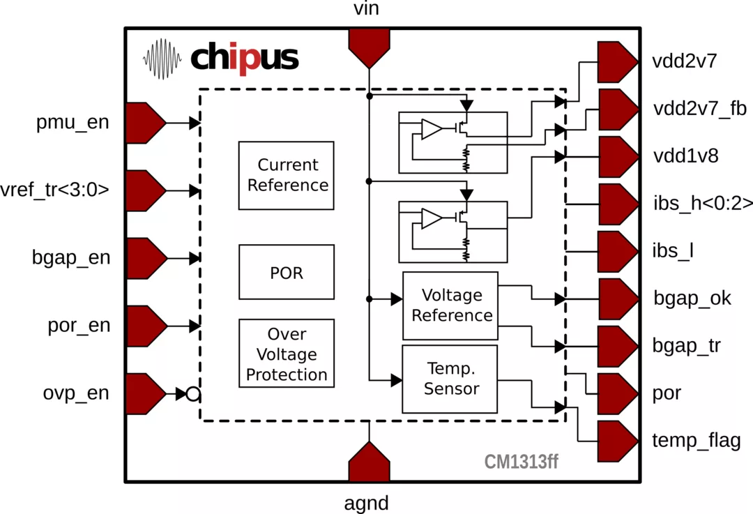 This macro-cell is a Power Management Unit (PMU) core designed for Silterra 0.18µm C18GH5 CMOS technology in TO (thick oxide) and HP (thin oxide) process.