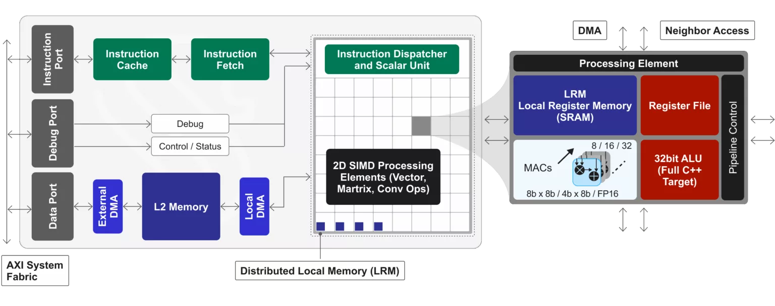 - Optimized for INT8 machine learning inference (with optional FP16 floating point MAC support, and A8W4 MAC option) plus 32b ALU DSP ops for full C++ compiler support