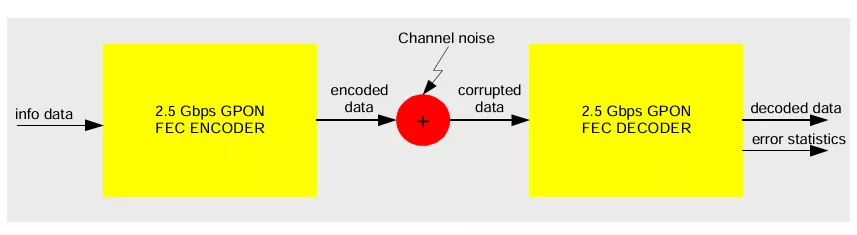 This high performance core is a full featured Forward Error Correction encoder and decoder, specially designed for high speed optical networks or any other broadband applications. It is fully compliant with the 2.5 Gbps GPON standard (G.984.3) and is available for FPGA or ASIC implementation. The FEC algorithm is based on Reed-Solomon (255,239) code and consists of an encoder and decoder module. The encoder module computes 16 parity bytes and appends them on the 239 byte information block. The decoder receives the 255 bytes codeword, locates and corrects up to 8 byte errors being introduced in the transmission channel.