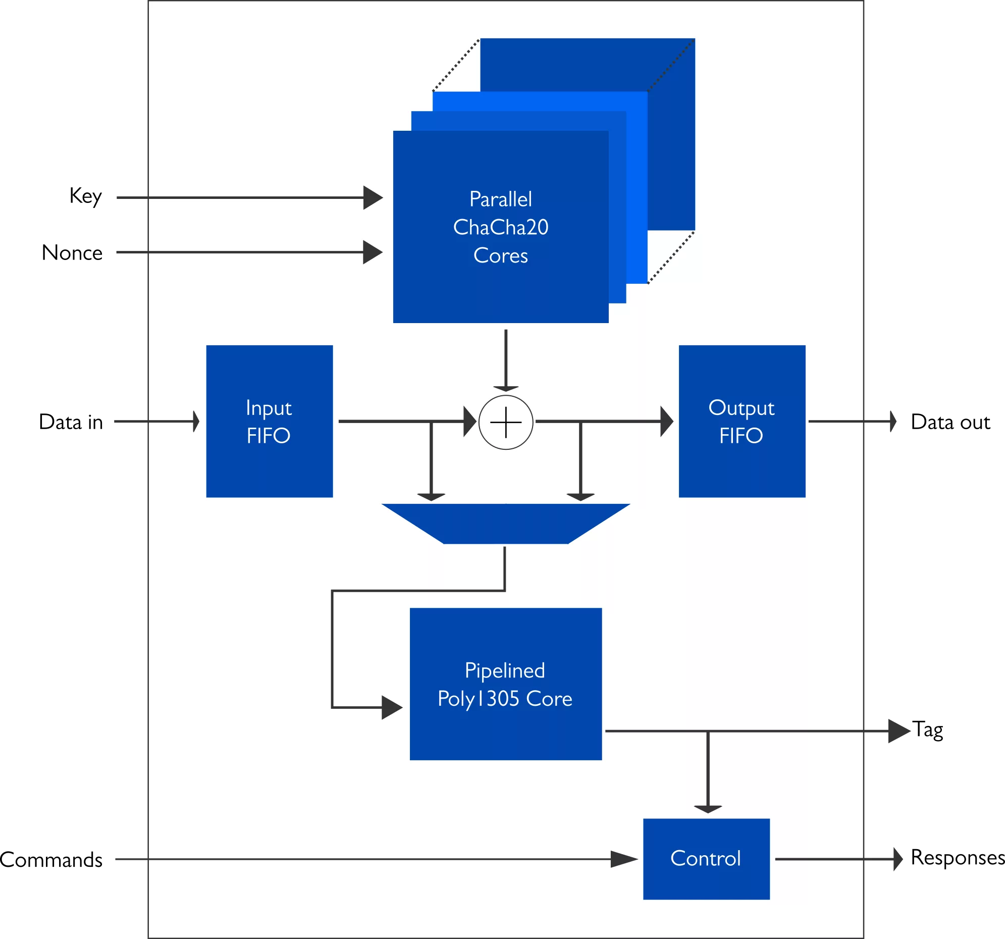 XIP2113H from Xiphera is a high-speed Intellectual Property (IP) core designed for ChaCha20-Poly1305 Authenticated Encryption with Associated Data (AEAD) scheme protecting both confidentiality and authenticity at the same time. The current definitive standard for ChaCha20-Poly1305 is RFC 8439, “ChaCha20 and Poly1305 for IETF Protocols”.