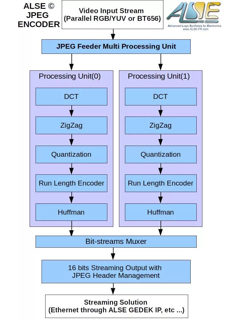 • 8 bits (byte) Streaming output interface with Backpressure. Easy to connect to the ALSE Ethernet communication engine for example. Output format is 8x8 YUV Blocks (4:2:2).