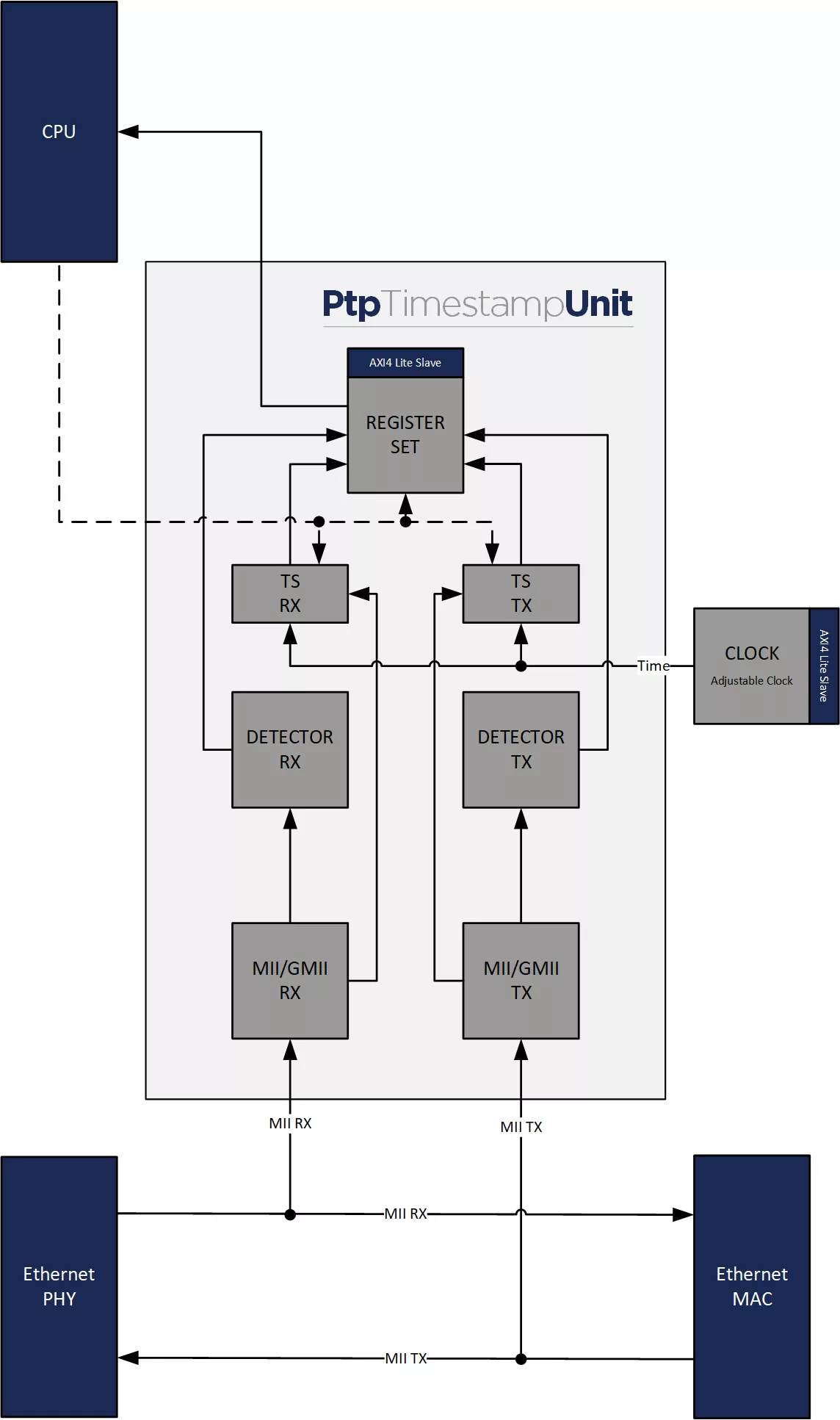 NetTimeLogic’s PTP Timestamp Unit is an implementation of a single port Frame Timestamp Unit (TSU) according to IEEE1588-2008 (PTP). It detects PTP frames on a (R)(G)MII tap and timestamps PTP event frames based on a Counter Clock and provides them delay compensated to a PTP Software stack (e.g. PTPd, PTP4l, etc…). The Timestamp Unit can work as PTP Ordinary Clock (OC) as Master and Slave; it can also be used to build a PTP Boundary Clock (BC) by having multiple instances of the IP core connected to multiple Ethernet ports. All configuration can be written, and timestamps read via an AXI4Light-Slave Register interface.