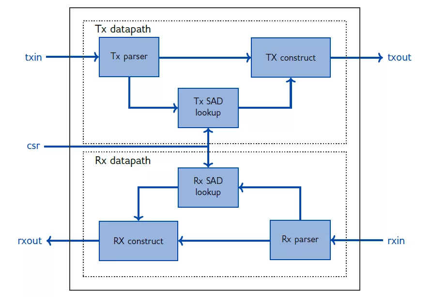 The functionality of XIP7213E is divided into the transmit (Tx) and receive (Rx) datapaths, which operate independently of each other. The underlying cipher suite AES-GCM is consequently instantiated for both the Rx and Tx datapaths.