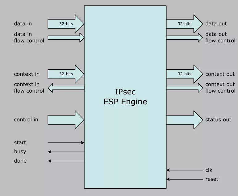 - Fully configurable to support all mandatory and proposed ESP-v3 confidentiality and integrity algorithms