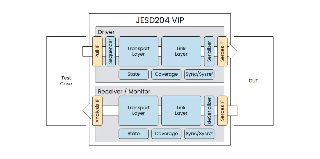 JESD204 Verification IP provides an advanced and efficient solution for verifying and debugging JESD204B, JESD204C, and JESD204D standards in a UVM simulation environment, based on a verification IP. The driver will send test case controlled JESD traffic on the Serdes interface to the DUT RX. DUT TX traffic will be received and monitored.