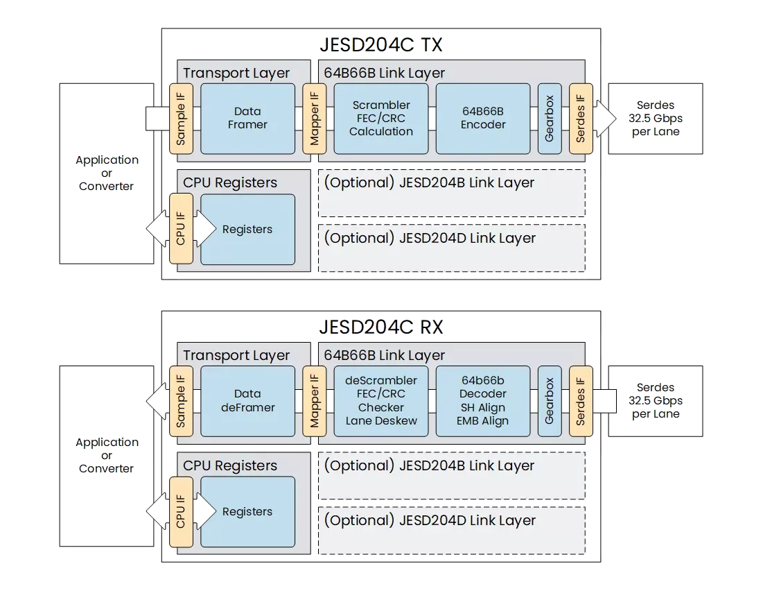 JESD204C delivers all the features of the standard. The solution includes separate RX,TX modules containing the link layer and transport layer. The IP is backward compatible with JESD204B