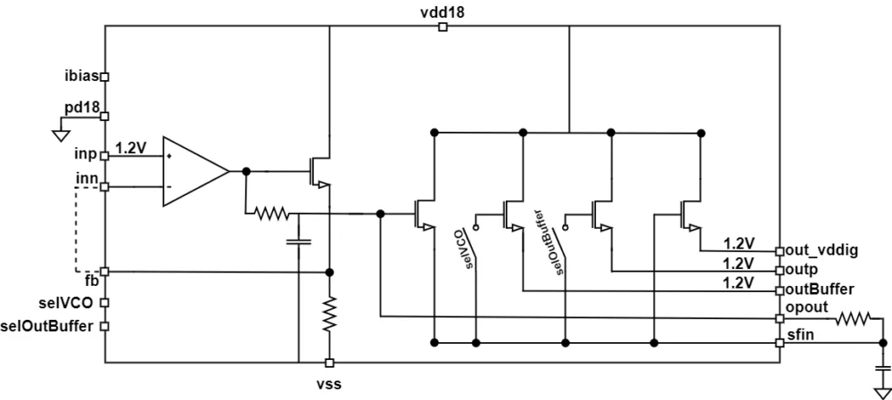 The WEALDO18NI12SFN32M22G is a voltage regulator operating from 1.8 V. It provides three output voltages 1.2 V driving output load that sinks specific current. The first output voltage applies to the VCO, the second drives the OutBuffer and the last one drives the digital circuitry.