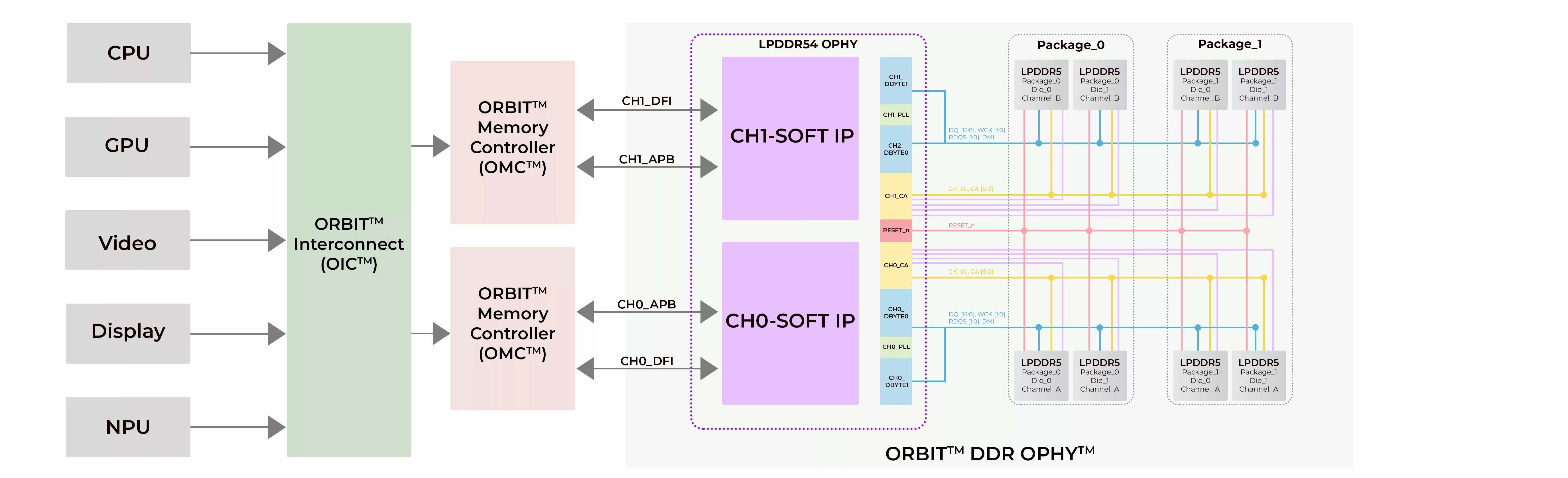 The ORBIT Memory system consists of interconnect, memory controller, and PHY IPs that work in unison to create maximum system synergies. The ORBIT DDR PHY (OPHY) features a state-of-art mixed-signal architecture that addresses the challenges of DRAm integration in high-performance and low-power environments. This architecture enables OPHYs to overcome issues with long-term impedance drift and clock phase drift, allowing impedance and clock phase updates without interruption of data traffic. Programmable timing at the OPHY boundary combines flexibility with analog precision, resulting in low read/write latency between the ORBIT Memory Controller (OMC) and the DRAM.