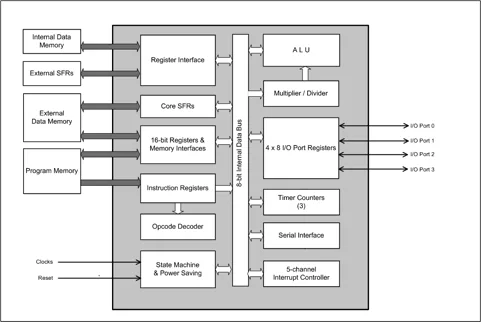 - Power Management: The M8052 offers two power saving states. These are implemented by dividing the core logic into two synchronous clock domains using optional clock gates. These reduce power consumption by 75% in the idle state and to leakage levels in the powerdown state.