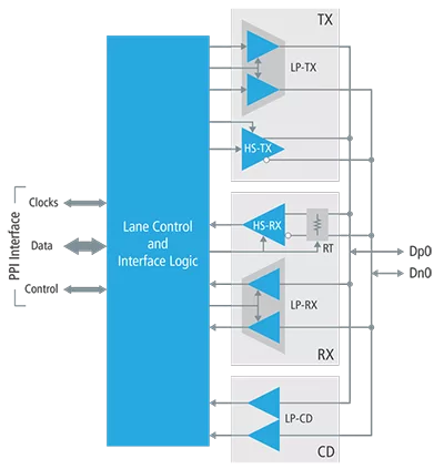 - Complete Function for HS TX/RX, LP TX/RX, and LPCD with automatic termination control for high-speed and low-power modes