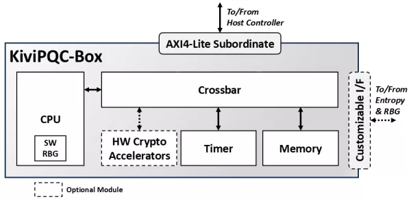 The engine offers multi-mode operation to support all the above procedures. It supports all parameter sets for ML-KEM (ML-KEM-512, ML-KEM-768, ML-KEM-1024) and for ML-DSA (ML-DSA-44, ML-DSA-65, ML-DSA-87). It is based on a RISC-V-like SoC topology, including a 32-bit RISC-V based processor. Designed for straightforward integration, the communication with the host is accomplished via an AMBA® AXI4-Lite Subordinate port.