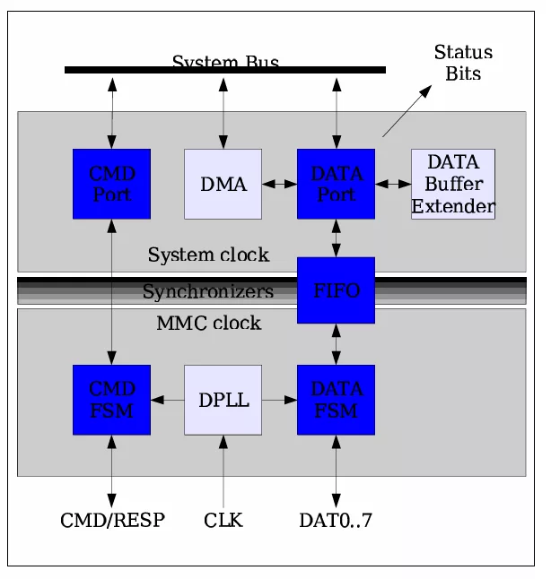 The front end of the core consists of command and data state machines driven by MMC clock. The back end consists the programing interface entities (Command Port and Data Port) and is driven by the same clock domain of the system bus. The control and status signals that cross the two clock domains are synchronized using 2-flop based paradigm, while the data are synchronized using a Dual-port FIFO.