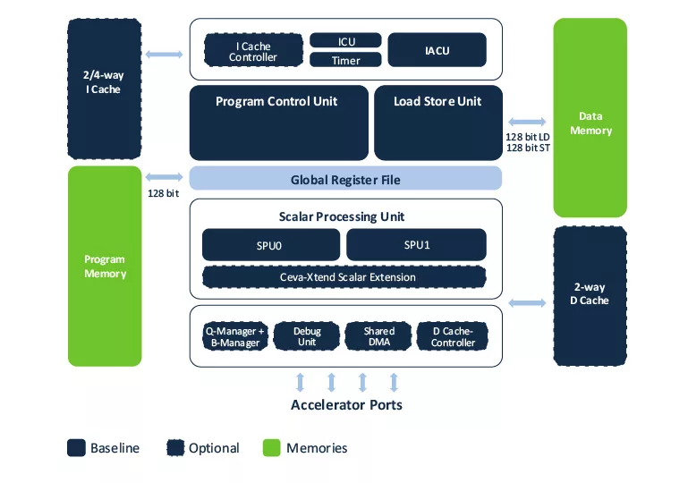 The Ceva-BX2 baseband processor IP handles both signal-processing and control workloads with up to 16 GMACs per second performance and high-level-language programming. It supports a range of integer and floating-point data types for a wide range of baseband applications like 5G PHY control, and exploits a high degree of parallelism, but with remarkably compact code size. Optimized high-speed interfaces expedite connection to other Ceva cores or to accelerators.