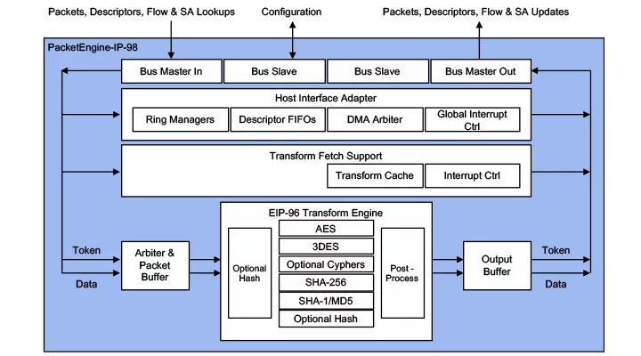 The Protocol-IP-196 Multi-Protocol Engine is a protocol-aware packet engine for accelerating IPSec, SSL/TLS, DTLS, 3GPP and MACsec up to 10 Gbps in multi-core application or communication processors offering a large selection of cipher algorithms. Designed for fast integration, maximum CPU offload and offering full transforms, it provides a reliable and cost-effective embedded IP solution that is easy to integrate into multi-core SoC designs. The Multi-Protocol Engine is pre-integrated with the DPDK, Linaro ODP and Linux crypto APIs. Therefore, this IP is designed for seamless integration of network security processing in systems, with its AMBA bus interfaces as well as these public APIs.