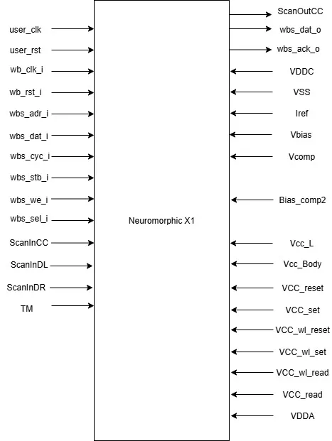 With integrated decoders and sense amplifiers, the X1 macro delivers 1kb of analog weight storage in a compact 0.28 mm² area. Its Wishbone bus compatibility ensures seamless integration into digital SoCs, including Caravel-based platforms.