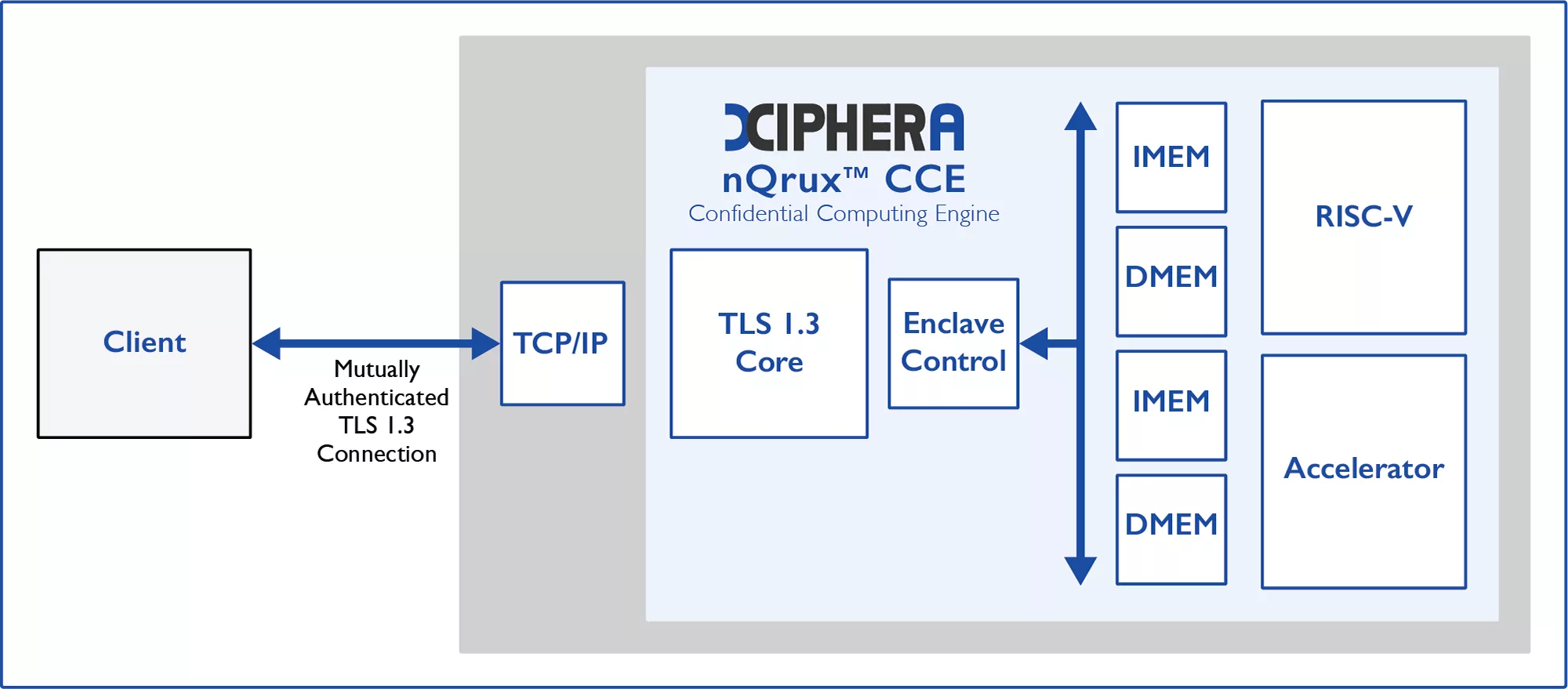 nQrux™ Confidential Computing Engine (CCE) offers customisable solutions protecting data, code execution, and AI (Artificial Intelligence) models in distributed environments, such as cloud and edge. nQrux™ CCE solutions are tailored and optimised according to customer application, performance, and security requirements, to host customised computing resources (e.g. CPU cores and application-specific accelerators).