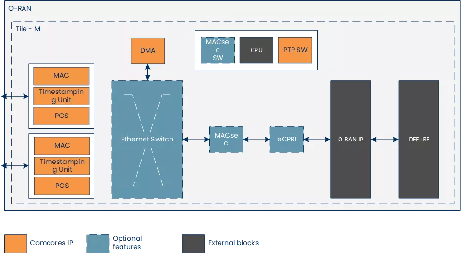 O-RAN Fronthaul Transport subsystem is a pre-integrated IP solution for the fronthaul transport of the O-RAN Radio Unit (O-RU). The IP cores inside this pre-integrated solution are tailored to work together efficiently, thus simplifying the integration into an FPGA or ASIC.