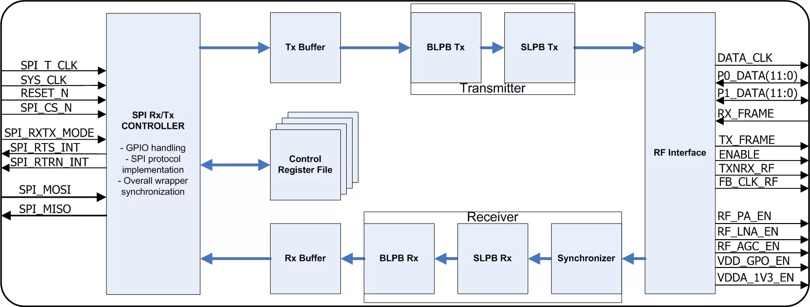 Noesis Technologies ntOFDM_BBP is a custom baseband processor, which implements the physical layer of an OFDM, time division duplexing (TDD) system. The baseband processor includes both transmission and reception bit-level and symbol-level processing chains including a sophisticated synchronization unit. The host interface is based on SPI protocol as well as with handshaking/interrupt ports. This custom system implements a subset of 802.16d standard functional options/features and is highly configurable via the integrated register file. An RF interface module is also included, compatible with Analog Devices AD9361 RF transceiver.
