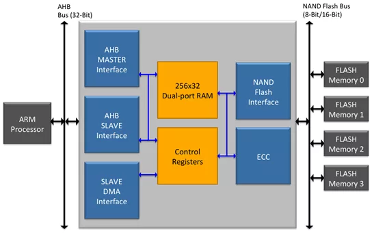 ONFI2.3 NAND Controller IP core supports the Open NAND Flash Interface Working Group (ONFI) 1.0, 2.0, 2.1, 2.2 and 2.3 standards and the Micron ClearNAND. It can also support a variety of host bus interfaces for easy adoption into any design architecture – AHB, APB, OCP, 8051 or custom buses. The slave AHB IP supports an external DMA interface where the master AHB incorporates an internal DMA controller.