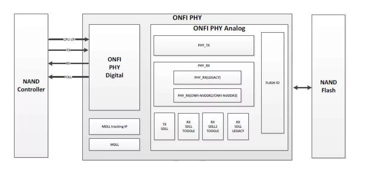 ONFI PHY block is used to either transmit signal and data to NAND Flash interface or receive the data from NAND Flash by Flash co…