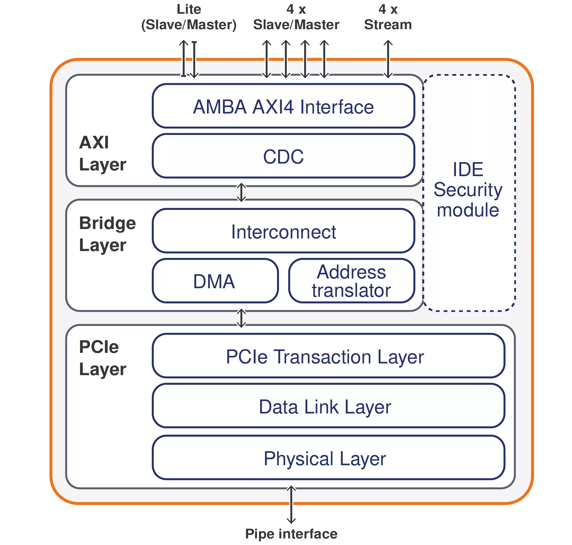 • Configurable pipelining enables full speed operation on Intel and Xilinx FPGA, full support for production FPGA designs up to Gen4 x8/Gen3 x16 with same RTL code - Gen5 support pending