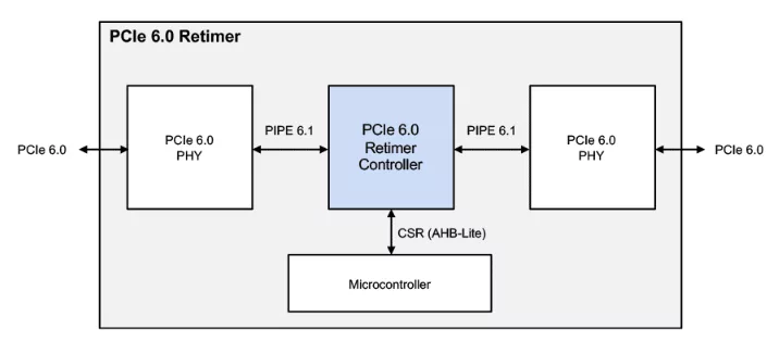 The PCIe 6.0 Retimer Controller provides a highly optimized low-latency data path for signal regeneration. It supports retimer chip PHYs via PIPE 5.2/6.1 interfaces. The control plane interface is provided via CSR (AHB-lite). The PCIe 6.0 Retimer Controller is CXL protocol aware and supports links using 64 GT/s and lower data rates of PCIe.
