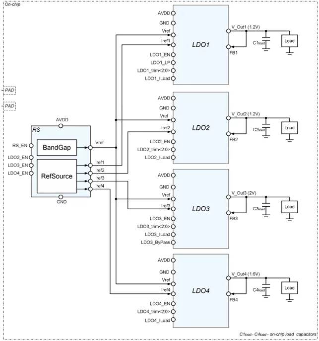 PMU is designed to supply integrated circuits with stable and precise voltage. 055UMC_PMU_01 is a library including RS block and 4 LDOs: LDO1 to supply digital circuits; LDO2 and LDO3 to supply analog circuits; LDO4 to supply flash memory. Each of LDO1-LDO4 has an option of choosing load current from 1mA to 50mA. LDO1 operates in two modes: “Full Power” from 1mA to 50mA load current and “Low Power” at 1µA load current to save battery charge if high performance of the system is not required.