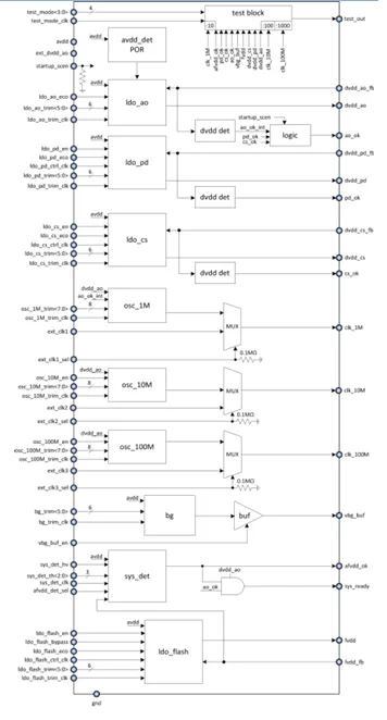 PMU is designed to supply embedded integrated circuits with stable and precise voltage and 1%-accurate clock frequency. It integrates 4 LDOs and 3 oscillators:
