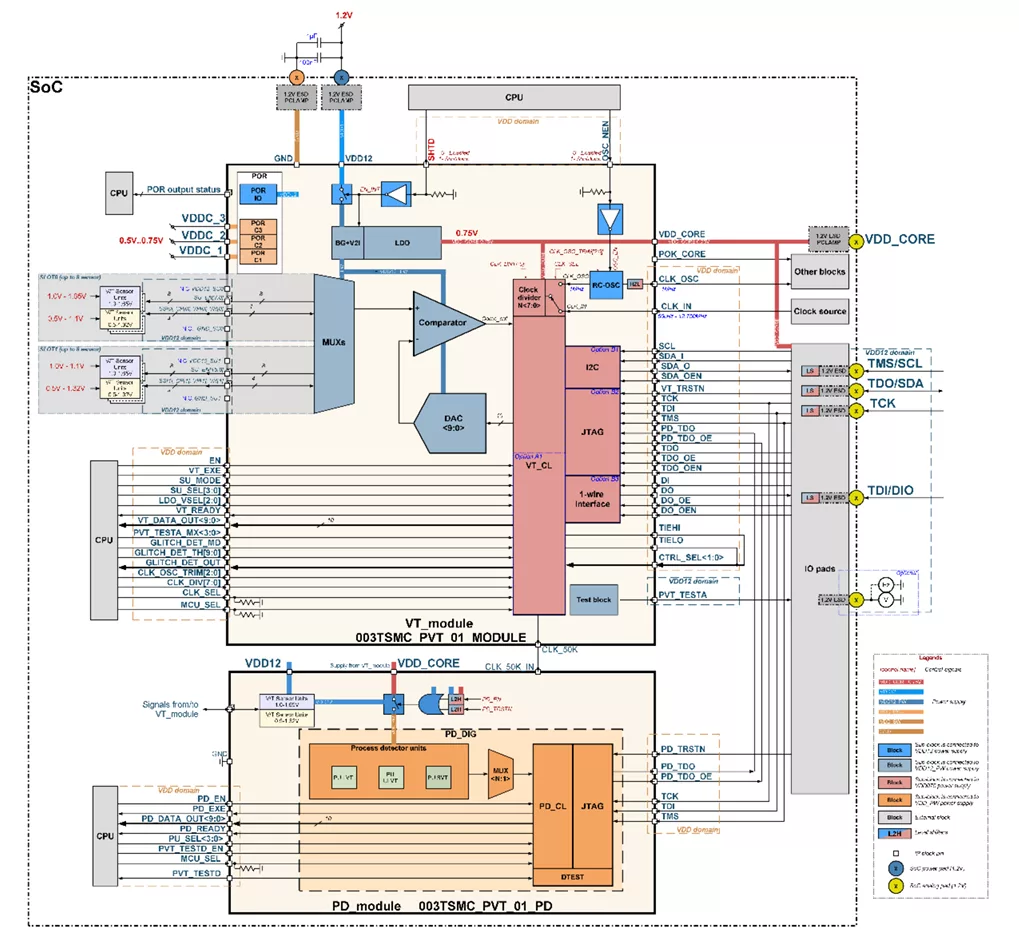 - VT module as a calculation center for voltage and temperature measurements. It is able to maintain up to 16 on die voltage/temperature units to be put on over the die. Grape-like connection is intended for easy routing and sensors placement