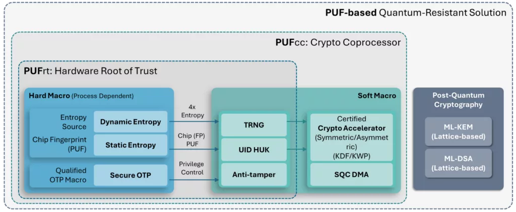 - Anti-quantum asymmetric key pairs are generated by PUF-based PQC engines.