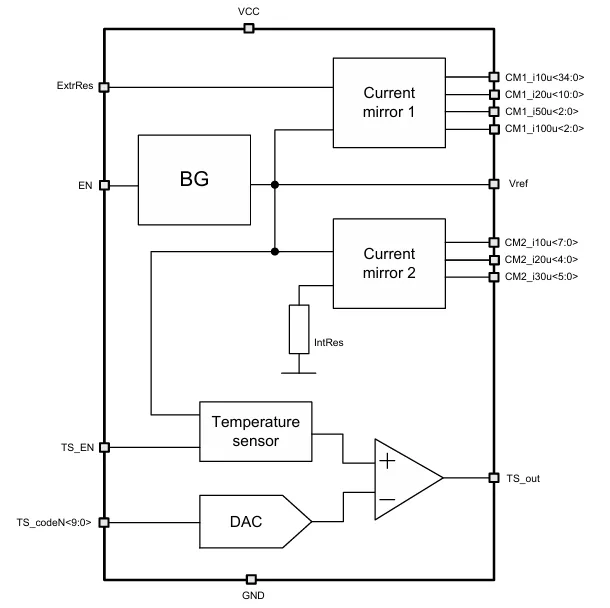 Reference current and voltage source (RS) is used to supply analog blocks. It is based on bandgap reference voltage source, forming temperature compensated voltage, and two voltage-to-current converters. First converter uses an external resistor and output current has weak temperature dependence. Second converter uses an internal resistor and output matches internal resistor temperature and process variations.