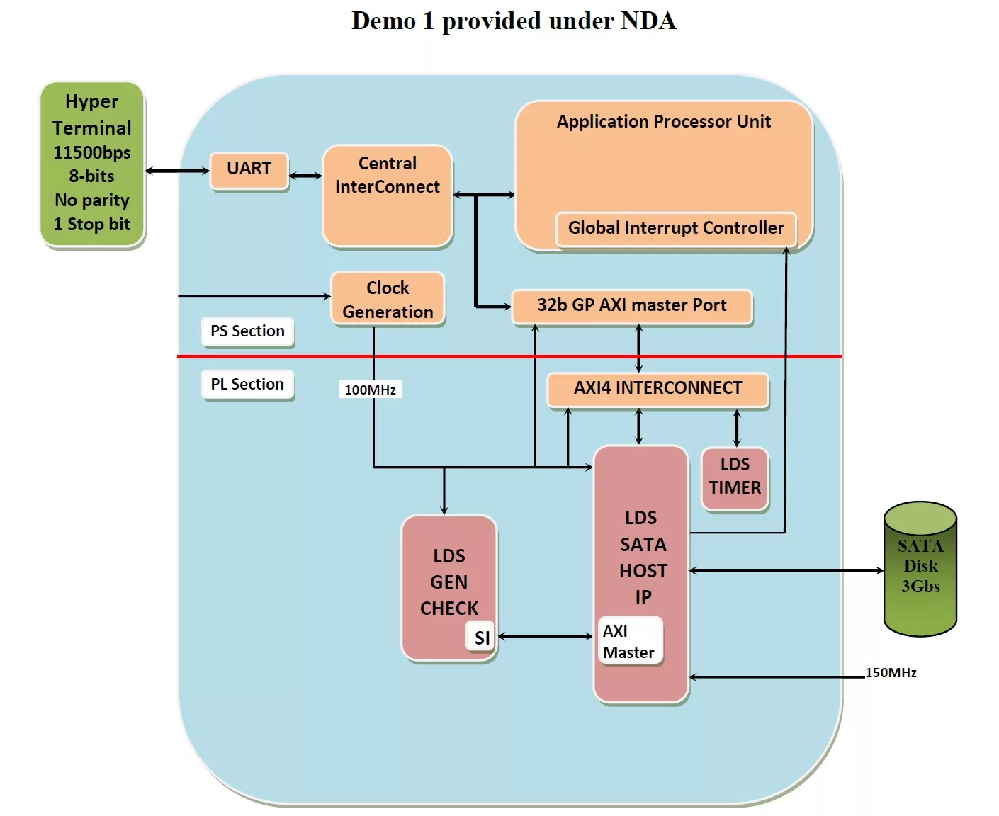 The LDS SATA 3 HOST XA7 IP incorporates the Transport layer, the Link layer and the PHY layer on a Xilinx Artix 7 speed grade 2 FPGA. The LDS SATA 3 HOST XA7 IP is compliant with Serial ATA III specification and signaling rate is fixed to 6Gbs. The LDS SATA 3 HOST XA7 IP is fully synchronous with system frequency (Clock_sys) at 75MHz in case of 3Gbs speed selection and 150MHz in case of 6Gbs speed selection. The source code format is available for ease of customization. The customization can be done by Logic Design Solutions and DO254 documentation is available on request.