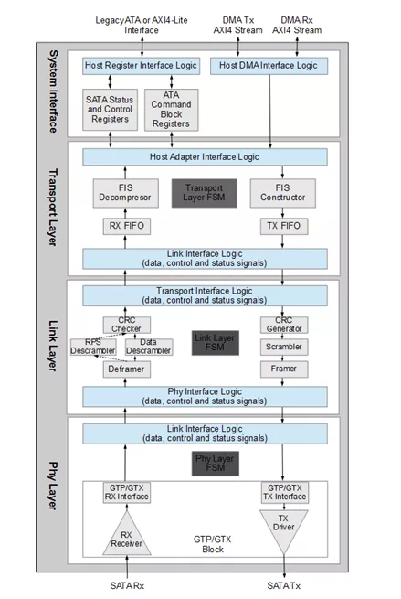 SATA-III Host Controller core implements physical, link and transport layers. It can use both RocketIO GTP and GTX transceivers found in Xilinx FPGA devices to implement physical signaling required by the SATA specification. For the interface with the host processor IP core uses standard PATA interface, and for the interface with the DMA engine simple TX and RX transaction interface.