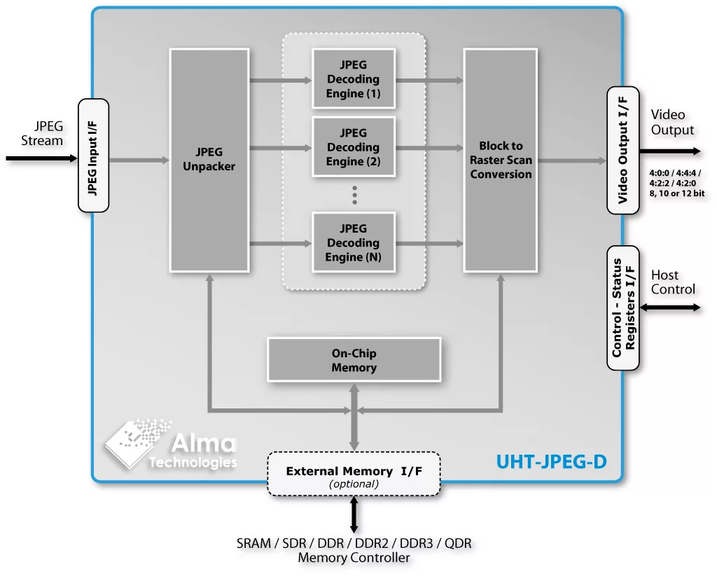 Scalable Ultra-High Throughput 8/10/12-bit JPEG Decoder is a Image Conversion IP core from Alma Technologies listed on Semi IP Hub.