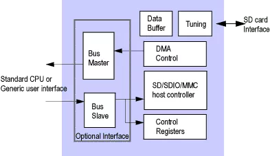 • Supports multi-function SD cards, command suspend, resume, and block transfers.