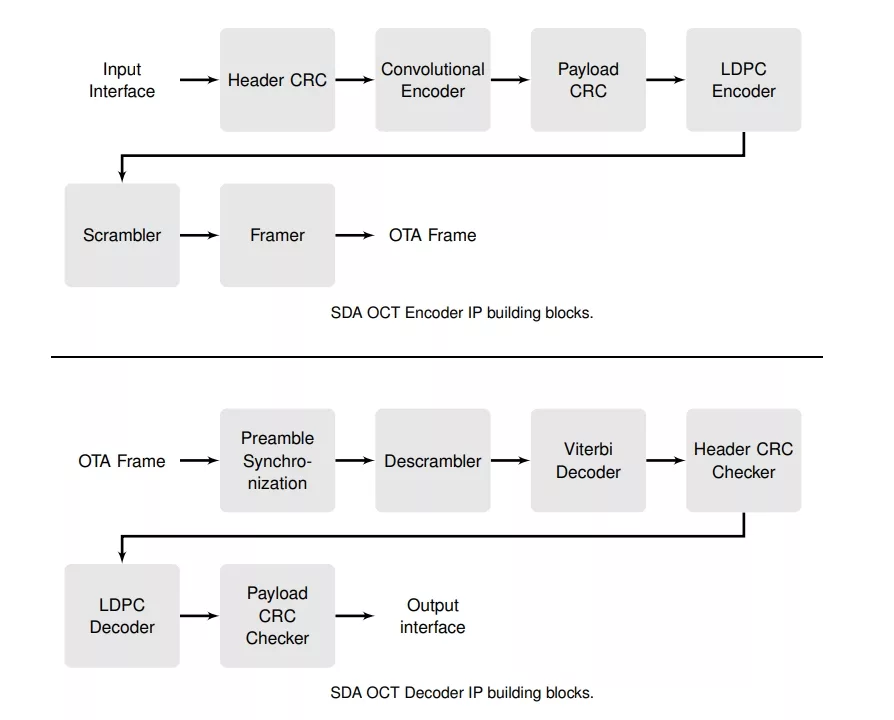 The Creonic SDA OCT Encoder handles the construction of Over-The-Air (OTA) frames as indicated in the standard, a preamble followed by a header and payload data, with both fields being protected by cyclic redundancy check (CRC) and forward error correction (FEC).