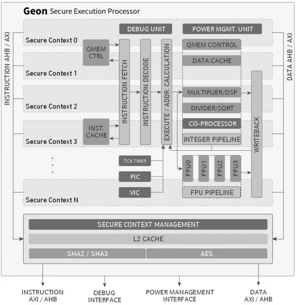 The Geon™ Secure Execution Processor is a low-power, 32-bit processor IP core with built-in protection of sensitive code and data. It uses two or more cryptographically separated execution contexts for a high degree of security during code execution and for data storage and transfer to and from the processor.