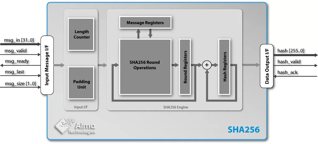 The SHA256 IP core from Alma Technologies is a high performance implementation of the SHA-256 Message Digest algorithm, a one-way hash function, compliant with FIPS 180-2.