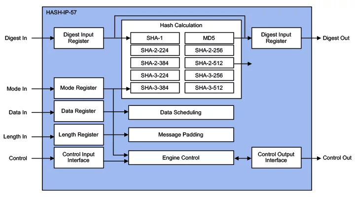 The HASH-IP-57 (EIP-57) is IP for accelerating the various secure hash integrity algorithms like MD5 (RFC1231), SHA-1 (FIPS-180-2), SHA-2 (FIPS-180-3/4) and SHA-3 (FIPS-202), supporting the NIST MAC mode up to 6.4 Gbps @ 450MHz. Designed for fast integration, low gate count and full transforms, the HASH-IP-57 accelerators provides a reliable and cost-effective embedded IP solution that is easy to integrate into high-speed crypto pipelines.