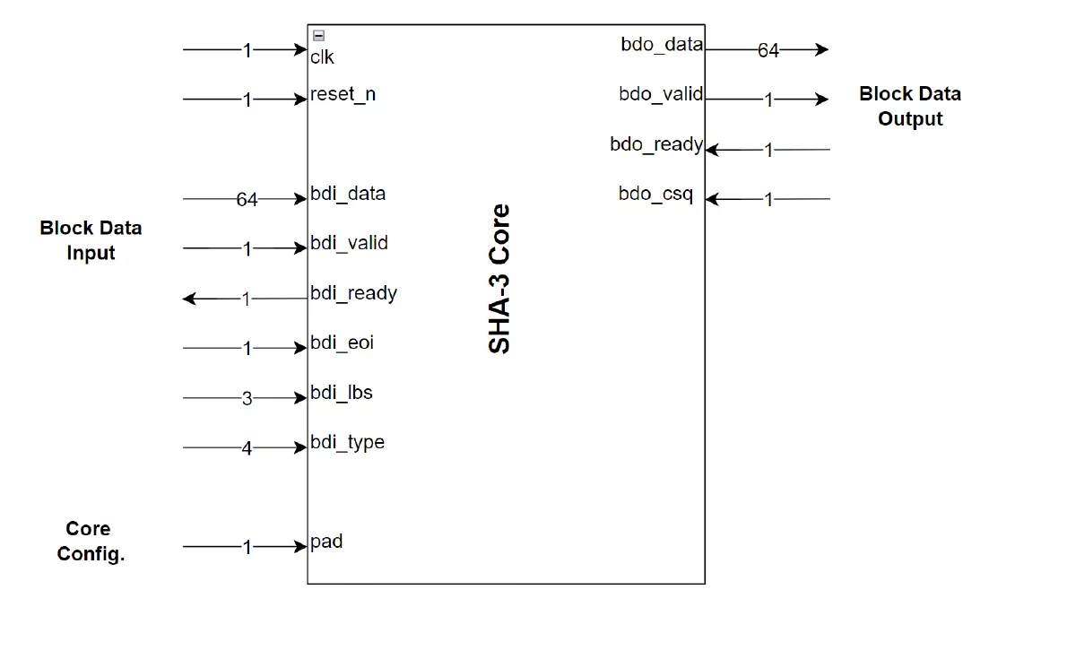 eSi-SHA3 is area-efficient hardware accelerator core for the SHA3 and SHAKE cryptographic hashing algorithms compliant with the NIST FIPS 202 standard.